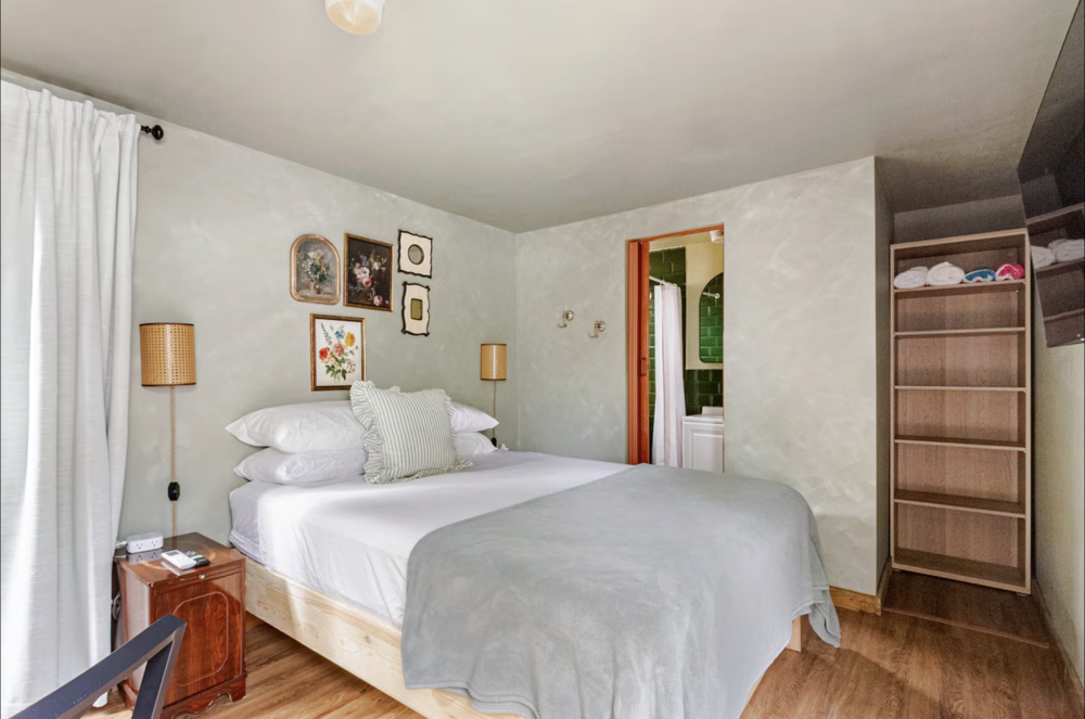 This charming one-bedroom suite is the ideal escape for couples and honeymooners. It features a cozy queen bed, a living room, and a beautifully designed en suite spa bathroom with a floating bathtub, walk-in shower, and antique armoire—creating a serene, romantic ambiance.