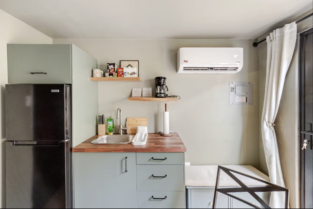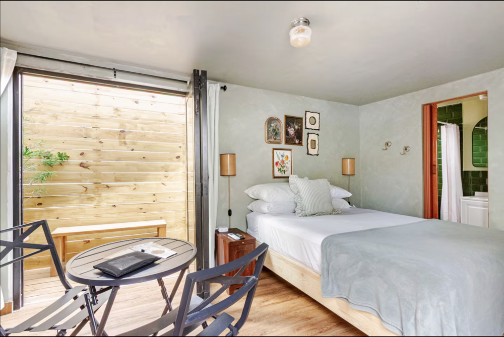 A cozy private room for solo travelers or couples, located on the ground floor with direct access through the Secret Garden. Features a queen bed, cold A/C, smart TV with Netflix, kitchenette and a private bathroom with hot water shower. Includes a small private outdoor area with a dining table, tropical plants, and a outdoor shower. Guests also have access to the shared Secret Garden, a relaxed common area with seating, greenery, and space to unwind. Ideal for guests looking for a simple, comfortable space with privacy and easy access to downtown Luquillo and the beach.